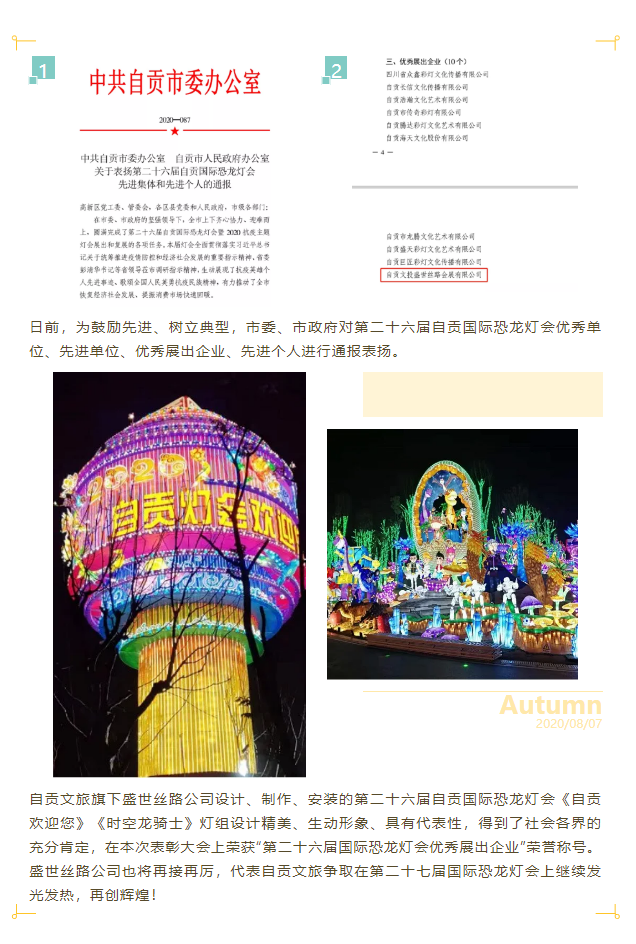 盛世絲路公司榮獲“第二十六屆自貢國(guó)際恐龍燈會(huì)優(yōu)秀展出企業(yè)”榮譽(yù)稱(chēng)號(hào)