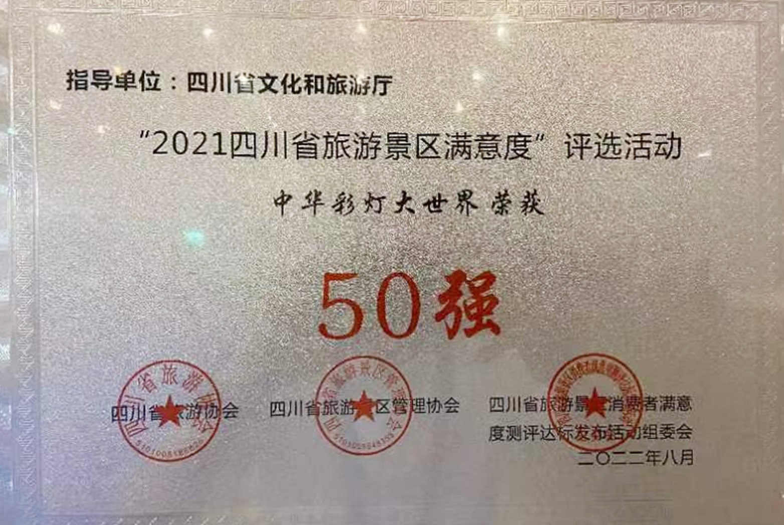 8月26日,第五屆中國(成都)旅游景區(qū)創(chuàng)新發(fā)展博覽會在成都世紀(jì)城新會展中心開幕。開幕儀式上,舉行了“2021四川省旅游景區(qū)滿意度”評選活動頒獎典禮,自貢·中華彩燈大世界榮獲全川旅游景區(qū)滿意度50強(qiáng)。