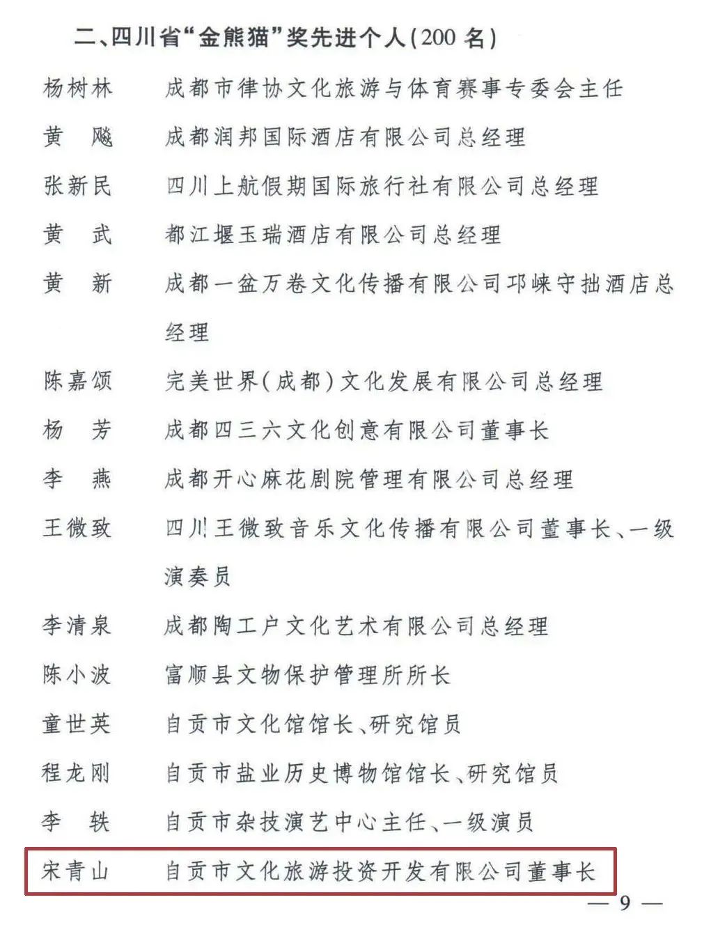 自貢文旅投公司雙喜臨門,不僅被授予第三批“四川省文化旅游產(chǎn)業(yè)優(yōu)秀龍頭企業(yè)”,董事長(zhǎng)宋青山還榮獲省“金熊貓”獎(jiǎng)先進(jìn)個(gè)人。