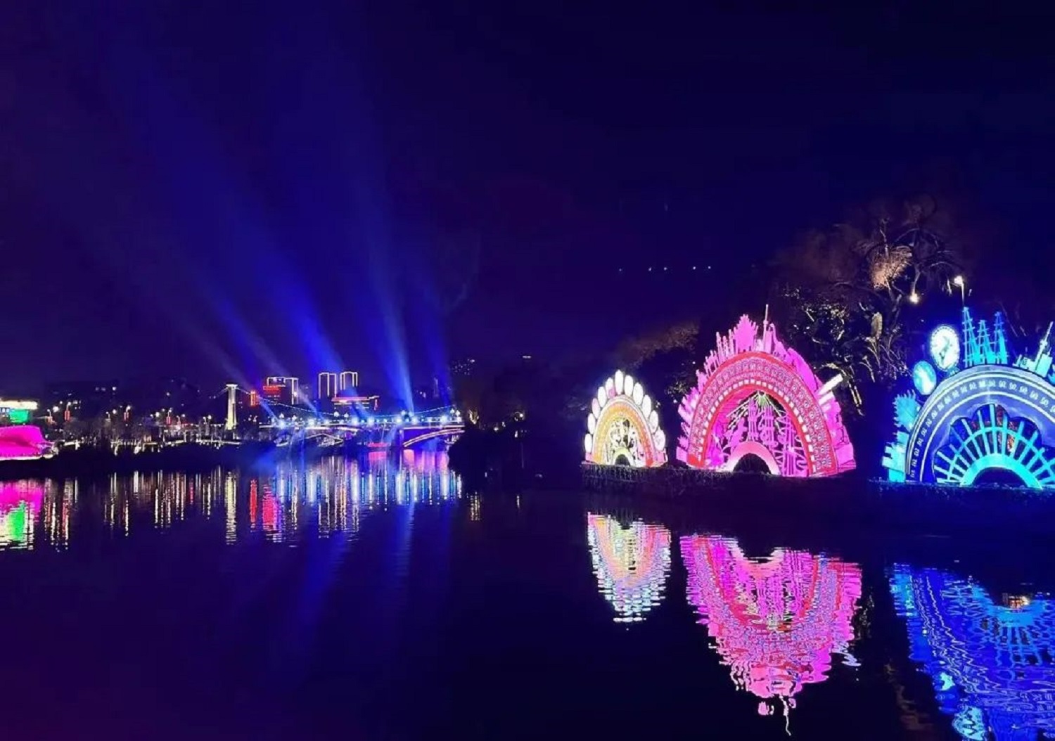 “這就是一幅自貢動(dòng)態(tài)版的《千里江山圖》!”成都游客陳明對(duì)善后橋與十字口大橋全新打造的光影秀“山河如畫”印象深刻。