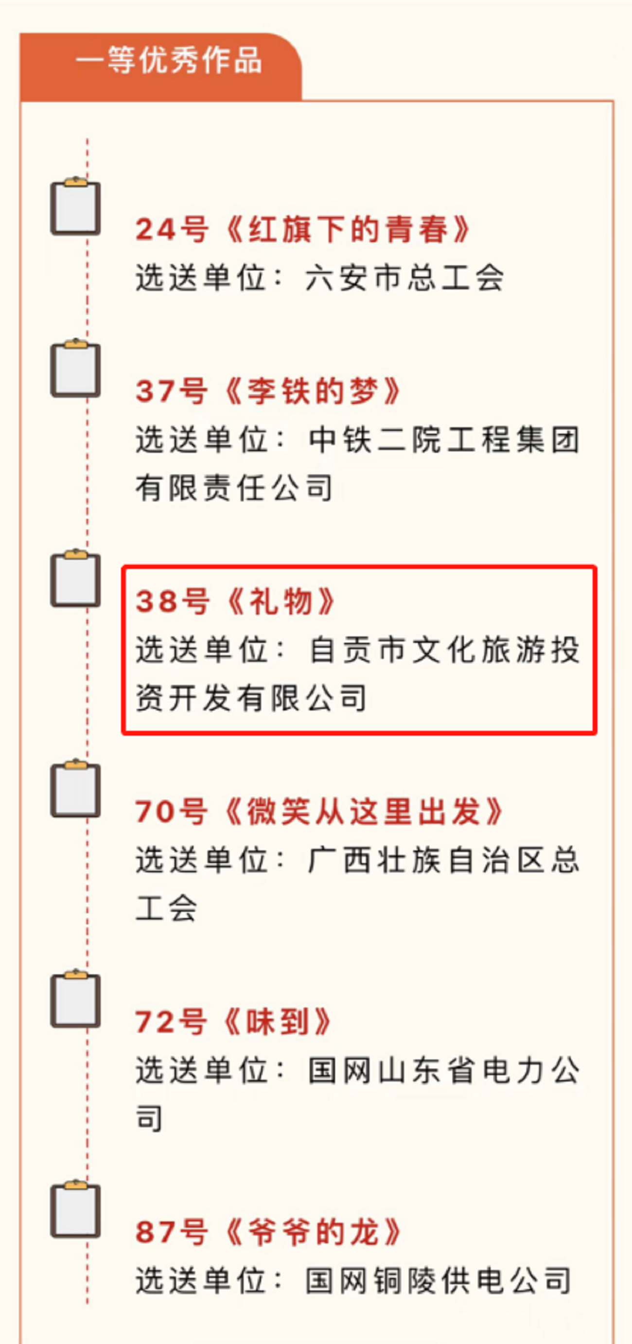據(jù)悉,“網(wǎng)聚職工正能量 爭(zhēng)做中國(guó)好網(wǎng)民”主題活動(dòng)已連續(xù)開(kāi)展了7年。2022年“網(wǎng)聚職工正能量 爭(zhēng)做中國(guó)好網(wǎng)民”主題活動(dòng)網(wǎng)絡(luò)正能量微視頻征集活動(dòng)于2022年8月26日起對(duì)外公開(kāi)征集,通過(guò)專家評(píng)審、線上展示、網(wǎng)絡(luò)投票三個(gè)階段,最終評(píng)出一等優(yōu)秀作品6名,二等優(yōu)秀作品9名,三等優(yōu)秀作品15名等獎(jiǎng)項(xiàng)。其中,自貢文旅投公司拍攝的微電影《禮物》成為了6名一等優(yōu)秀作品之一,也是四川省唯一榮獲的一等獎(jiǎng)優(yōu)秀作品。