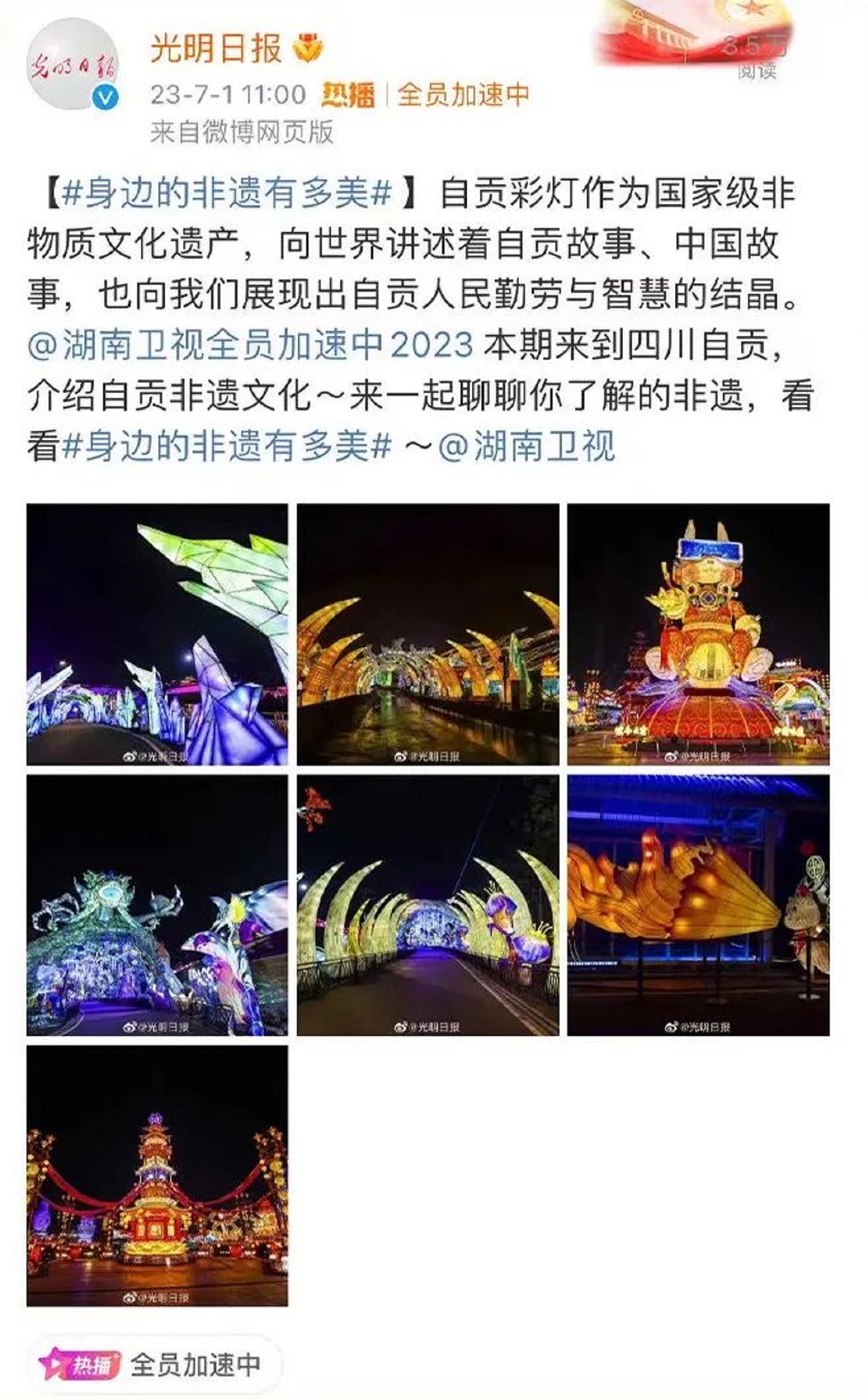 對此,《光明日報》微博以“身邊的非遺有多美”為主題,對本期節(jié)目給予了積極的肯定和贊美?!豆饷魅請蟆吩谖⒉┲袑懙溃骸白载暡薀糇鳛閲壹壏俏镔|(zhì)文化遺產(chǎn),向世界講述自貢故事,展示自貢人民勤勞與智慧的結(jié)晶?!痹撛掝}登錄微博要聞榜14個地級行政區(qū)的同城熱搜,總曝光量達(dá)1.2億人次。