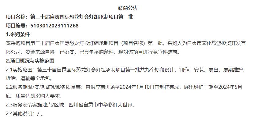 第三十屆自貢國際恐龍燈會燈組承制項目第一批競爭性磋商采購公告