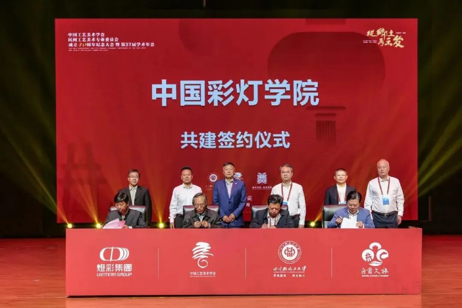 現(xiàn)場儀式上,中國工藝美術(shù)學(xué)會理事長才大穎向四川輕化工大學(xué)授牌“中國彩燈學(xué)院”,四川輕化工大學(xué)校長庹先國接牌。隨后,中國工藝美術(shù)學(xué)會副理事長呂品田,四川輕化工大學(xué)黨委常委、副校長高小林,自貢市文化旅游投資開發(fā)有限公司董事長宋青山,自貢燈彩文化產(chǎn)業(yè)集團(tuán)有限公司董事局主席黃德春作為代表上臺簽約。