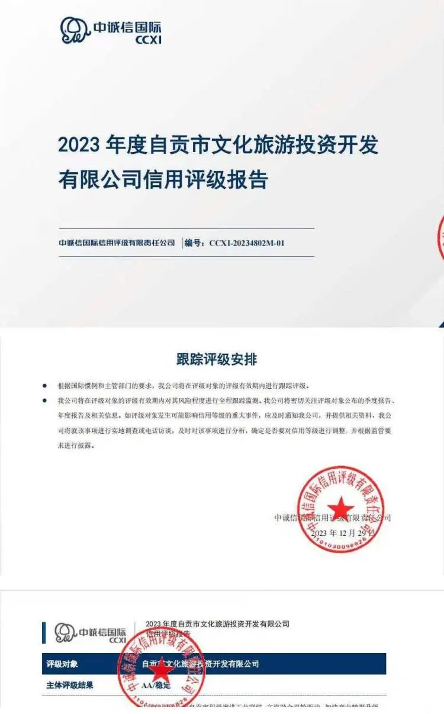 2023年12月29日,經國內主流評級機構中誠信國際信用評級有限責任公司對自貢文旅投的信用狀況進行綜合分析和評估,出具信用評級報告,主體評級結果AA,評級展望為穩(wěn)定。