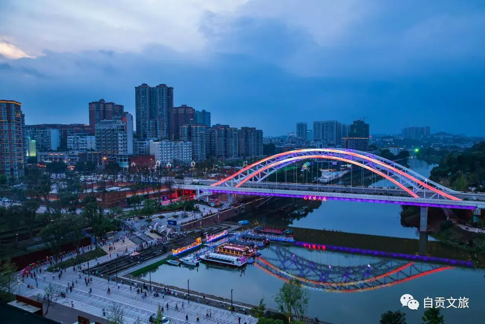 除了有夢(mèng)幻煙花秀,自貢文旅重磅推出的“夜游釜溪”精品游線也在開幕式正式“啟航”?!耙褂胃本酚尉€以“風(fēng)水寶地、人杰地靈”為游覽明線,以“釜溪夜游,福運(yùn)呈祥”為游覽暗線,充分利用釜溪河的自然姿態(tài),引進(jìn)高端光影景觀技術(shù),打造“一河三彎四段二十四景”,以群龍山嘯、龍鄉(xiāng)福地、百載蜀光、千載鹽都、還我河山、王爺鎮(zhèn)江等多個(gè)節(jié)點(diǎn),將釜溪河兩岸的歷史典故、人文風(fēng)情、風(fēng)光景點(diǎn),串聯(lián)成歷史與現(xiàn)代交融的精致遺珠,描繪出一幅鹽都古往今來,走向未來的美好畫卷。